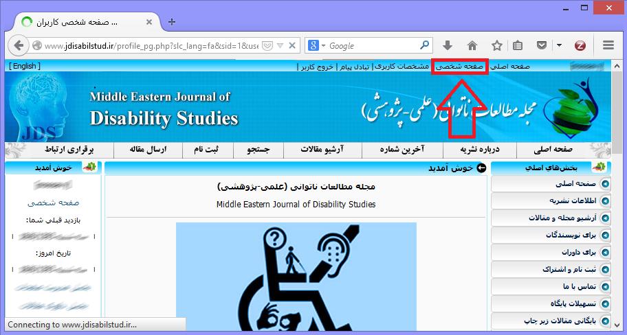 ۲. پس از وارد کردن نام کاربری و رمز عبور، صفحهٔ زیر را مشاهده خواهید کرد. در این صفحه بر روی قسمت نشانداده شده (صفحه شخصی) کلیک نمایید.